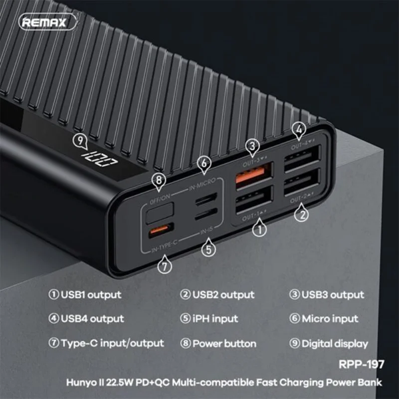 پاور بانک 30000 ریمکس مدل RPP-197 تعداد 5 درگاه خروجی شامل 4 یو اس بی و یک تایپ سی دارد، ولتاژ خروجی یو اس بی 1-2-3، 5 ولت در برابر 2 آمپر، ولتاژ خروجی یو اس بی 4، 5 ولت در برابر 4.5 آمپر – 5 ولت در برابر 3 آمپر و 9 ولت در برابر 2 آمپر است، خروجی تایپ سی 5 ولت در برابر 2 آمپر ولتاژ دارد. همچنین این شارژر همراه 3 ورودی تایپ سی، میکرو و لایتنینگ دارد که ولتاژهای 5 ولت و 9 ولت را به ازای 2 آمپر ایجاد می کند.