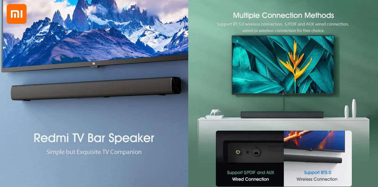 با استفاده از Redmi TV Soundbar MDZ-34-DA، دیگر نیازی به اسپیکر های قدیمی نخواهید داشت و منظره خانه تان نیز با سیم ها و کابل های طویل متعلق به این پخش کننده های صوتی خراب نخواهد شد. روش های اتصال این اسپیکر عبارت اند از اتصال بی سیم بلوتوثی و اتصال سیمی از طریق کابل AUX و کابل S/PFID. این نحوه اتصال دوگانه باعث شده تا دست کاربر در استفاده از این محصول باز باشد. استفاده از کابل سبب میشود تا بتوان آن را به تلویزیون، کامپیوتر های شخصی و دستگاه های DVD وصل کرده، در حالی که با اتصال بلوتوث عملاً میتوان هر دستگاه قابل حملی را به آن متصل کرد.