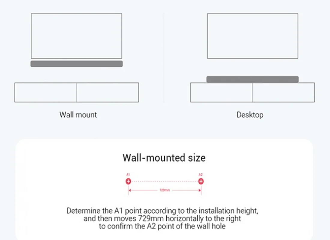 در جلوی محصول از صفحه فلزی مشبک استفاده شده تا صدای ساندبار شیائومی Redmi به خوبی در محیط پخش شود. در پشت دستگاه ورودی های AUX و S/PFID طراحی شده و در سمت چپ محصول، دکمه های کنترلی آن از قبیل روشن و خاموش، حالت بی صدا، کم و زیاد کردن میزان صدا، تغییر حالات بلوتوث میباشد که با یکبار فشردن یا نگه داشتن چند ثانیه ای آن ها انجام میشود. همچنین میتوانید این محصول را به صورت رومیزی استفاده کرده و یا به صورت دیواری نصب کنید.